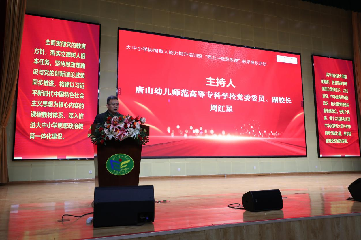 2026年1月9日,大中小学协同育人能力提升培训活动暨“同上一堂思政课”教学展示活动在北京景山学校曹妃甸分校成功举办。本次活动由中共唐山市委教育工委、市委宣传部、市民族宗教事务局联合主办,我校与曹妃甸区人民政府及北京景山学校曹妃甸分校共同承办。来自广西、西藏、内蒙古、新疆、宁夏等五省(区)及京津冀地区的教育工作者在线上线下齐聚一堂,以“中华民族一家亲”为核心主题,通过专家讲座、教学展示、主题班会等多种形式,共绘思政育人新图景。教育界元老顾明远、魏书生、冯恩洪为活动发来贺词,教育部基础教育司原副司长、国家督学郑增仪,教育部法规司原巡视员、雄安教育发展基金会理事长王家勤,北京景山学校原校长范禄燕、大中小学领导及教师500余人现场参加了活动。