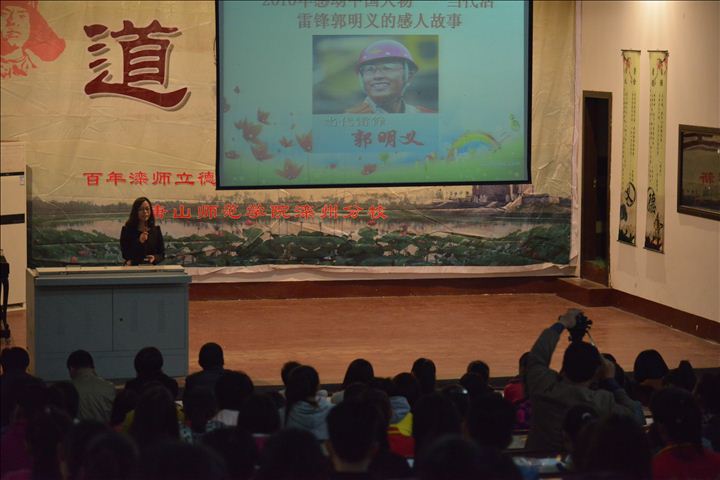 10月27日下午,在学校小礼堂举行了第11期“道德讲堂”活动。学校师生350多人参加了活动。 在场师生在主持人带领下首先进行“思省心”:你还记得雷锋吗?新时代我们该如何传承雷锋精神?课堂上你认真听讲了吗?平时见了老师你打招呼了吗?公交车上你主动为老人小孩让座了吗? “向雷锋同志学习!”主持人提问把大家引入本期活动主题——“热爱祖国,从身边小事做起”。全体师生齐唱歌曲《学习雷锋精神好榜样》,观看雷锋事迹短片《雷锋的故事》。 正当师生们还热议雷锋之时,唐山市优秀教师、学校理论教研室主任王美娜老师介绍了2010年感动中国人物——当代的“活雷锋”郭明义的感人故事。王美娜老师的讲解饱含深情,图文并茂。郭明义的事迹引起了在场师生的震动和共鸣:雷锋同志并没有离我们远去,今天我们仍旧需要弘扬雷锋精神,而且这个时代雷锋精神传承不乏其人! 在此基础上,全体师生在主持人带领下,齐诵经典“天下难事,必做于易,天下大事,必做于细”,并庄严承诺:“弘扬雷锋精神,尽己所能,从我做起,从身边小事做起,做一个爱国守法、明礼诚信、团结友善、勤俭自强、敬业奉献的社会主义接班人。” 活动现场,学校“道德讲堂”领导小组老师为大家赠送了“雷锋格言书签”。 此次活动还安排了撰写道德感悟、以班级为单位开展“庆祝建国65周年主题班会”等“行善举”活动。