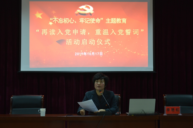 10月17日下午4:00,全体党员齐聚学校综合楼会议室,由党委书记李艳红同志主持,开展了“不忘初心、牢记使命”主题教育“再读入党申请、重温入党誓词”活动启动仪式。
